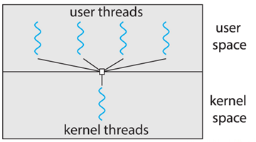 Many-to-One : One thread blocking causes all to block, Multiple threads may not run in parallel on muticore system because only one may be in kernel at a time