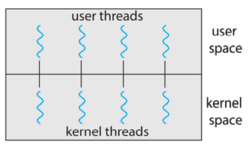 One-to-One : Each user-level thread maps to kernel thread, Creating a user-level thread creates a kernel thread More concurrency than many-to-one